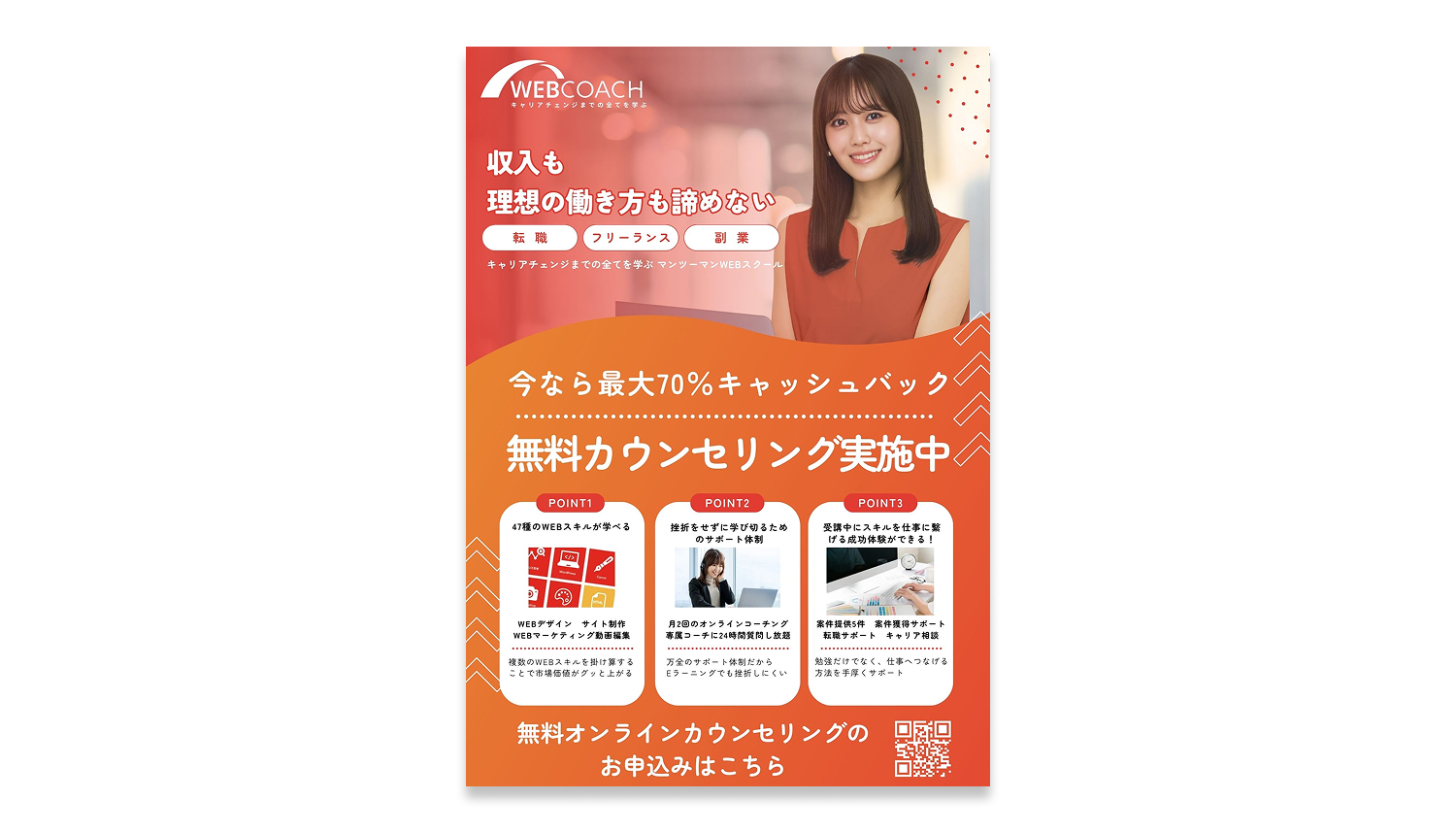 WEBCOACH は、 キャリアチェンジまでの全て を学び理想の”収入と働き方”、どちらも叶えるためのマンツーマンWEBスクール です。